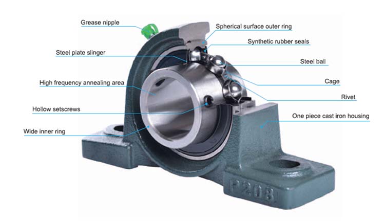 Ці одиниці - це поєднання радіальних кулькових підшипників, ущільнення та корпусу високогранного чавуну або пресованої сталі, які поставляються в різних формах. Зовнішня поверхня відповідного підшипника та внутрішня поверхня корпусу є сферичними, щоб одиниця вирівнювала себе.